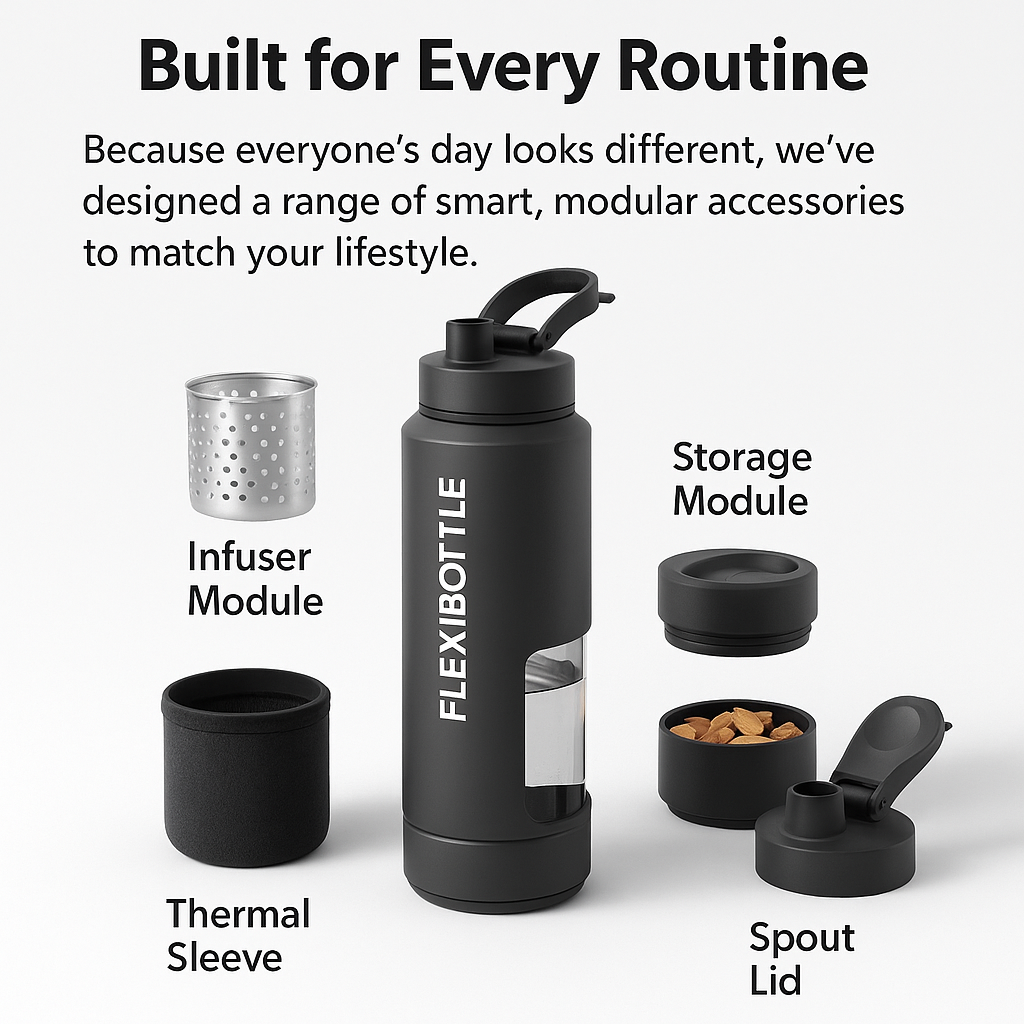 Add only the features you need – whether it’s an infuser for fresh fruit, a thermal sleeve for longer temperature control, or a storage module for your supplements. Your bottle, your way.